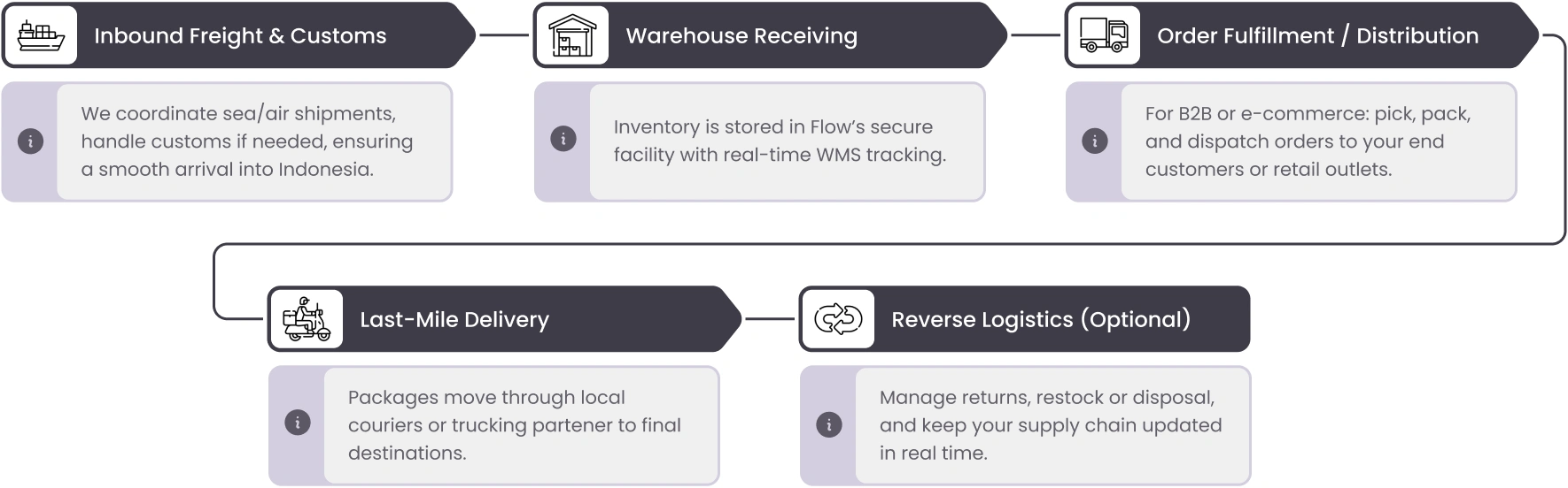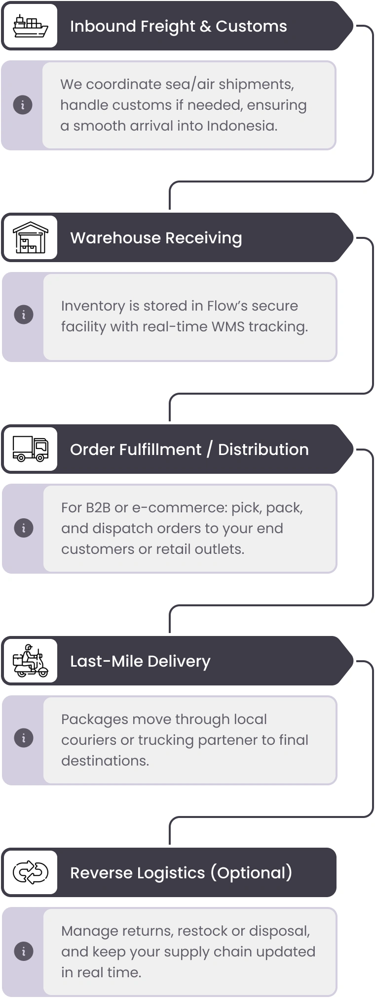 As part of a larger logistics group, Flow has direct access to sea/air carriers and customs support for inbound freight, along with a robust local network for storage and last-mile delivery. Once your goods arrive in Indonesia, we manage them end-to-end—from port pickup or airport clearance, to warehousing in our facility, and finally dispatching orders to their destinations via our trusted trucking and courier partners.